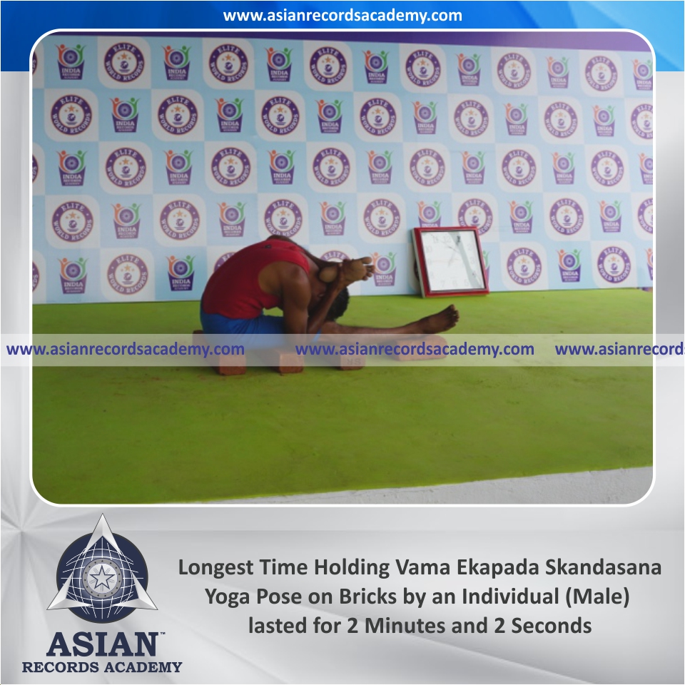 Longest Time Holding Vama Ekapada Skandasana Yoga Pose on Bricks by an Individual (Male)