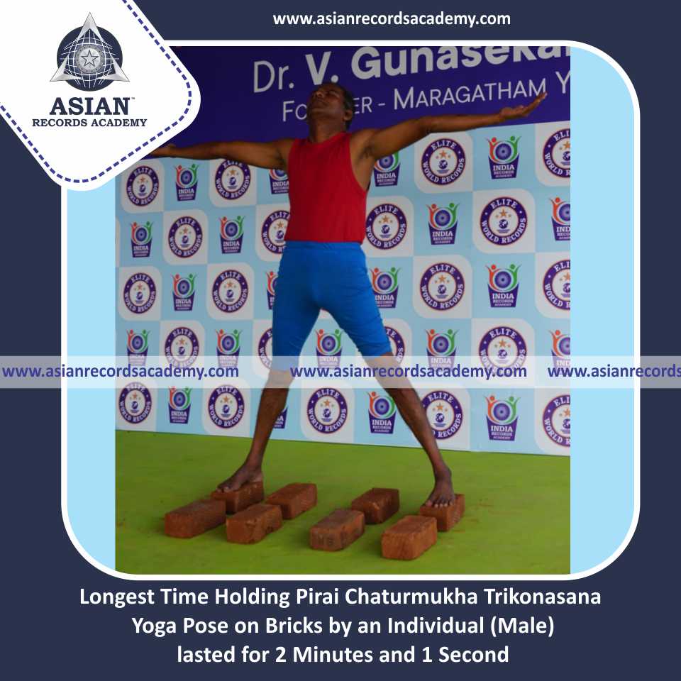 Longest Time Holding Pirai Chaturmukha Trikonasana Yoga Pose on Bricks by an Individual (Male)
