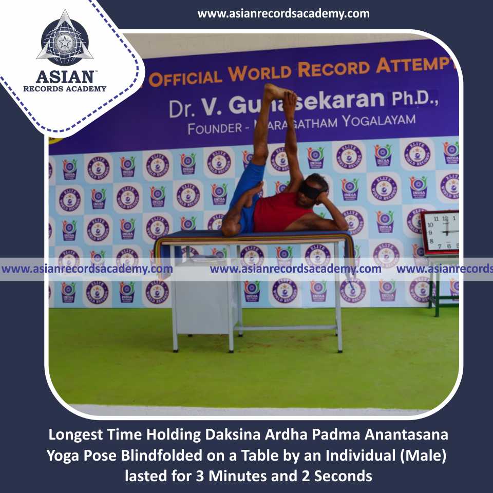 Longest Time Holding Daksina Ardha Padma Anantasana Yoga Pose Blindfolded on a Table by an Individual (Male)