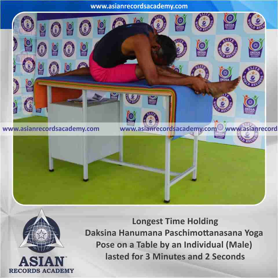 Longest Time Holding Daksina Hanumana Paschimottanasana Yoga Pose on a Table by an Individual (Male)