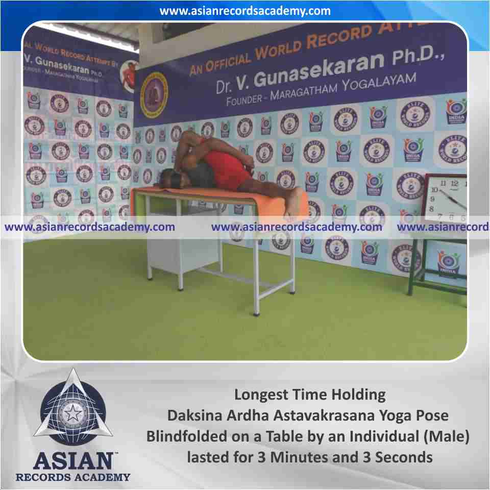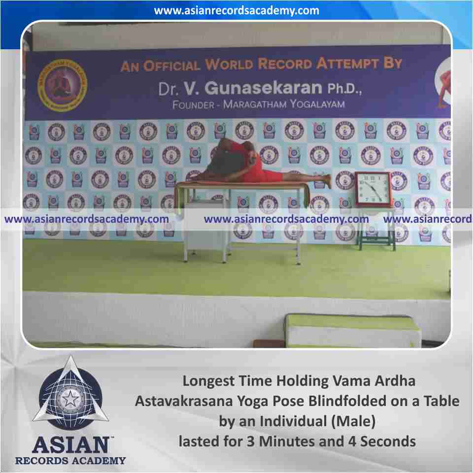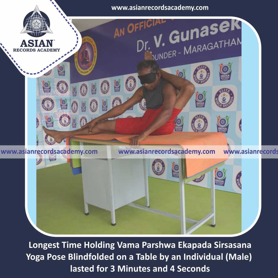 Longest Time Holding Vama Parshwa Ekapada Sirsasana Yoga Pose Blindfolded on a Table by an Individual (Male)
