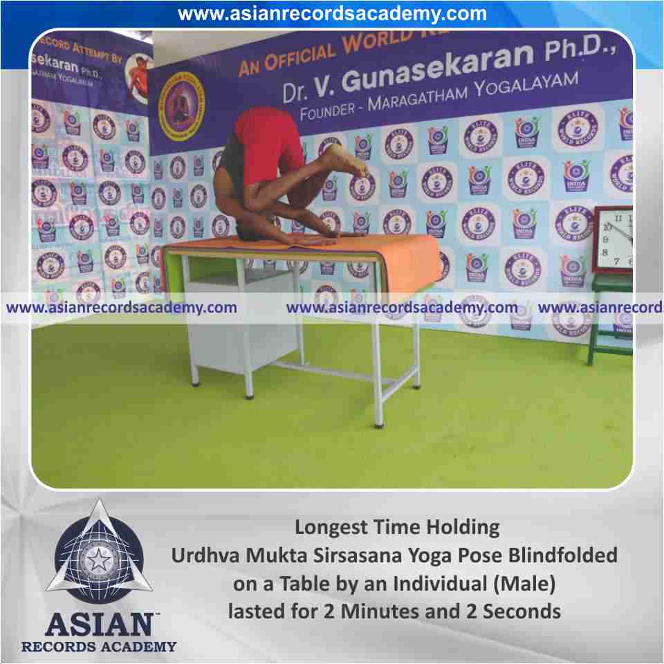 Longest Time Holding Urdhva Mukta Sirsasana Yoga Pose Blindfolded on a Table by an Individual (Male)