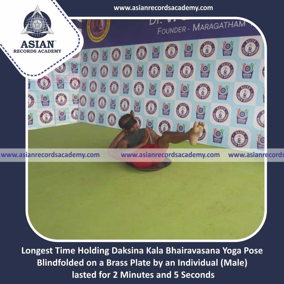 Longest Time Holding Daksina Kala Bhairavasana Yoga Pose Blindfolded on a Brass Plate by an Individual (Male)